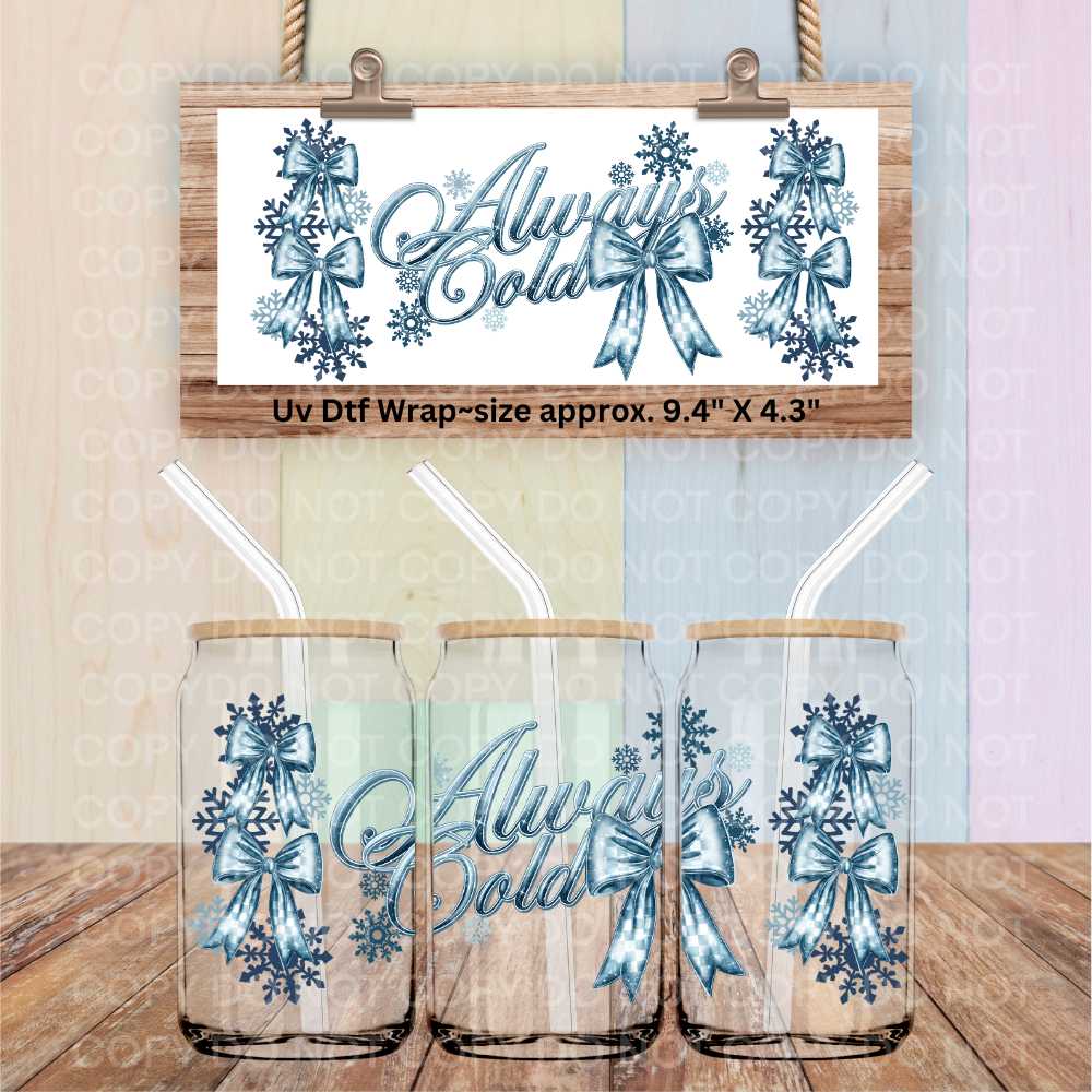 Embrace the chilly season with the Always Cold Single-Sided UV DTF Wrap, a stunning design perfect for showcasing your winter vibes. Featuring shades of blue with elegant blue bows and delicate snowflakes, this wrap is an icy yet cozy addition to your favorite drinkware.