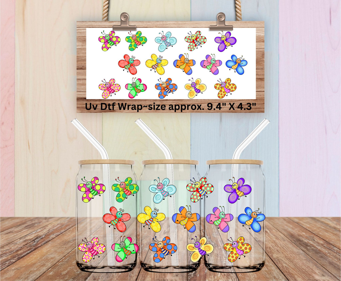 Uv Dtf Cup Wrap~ Doodle Bugs A Bright Floral Fun Design Depicting Cute Butterflies