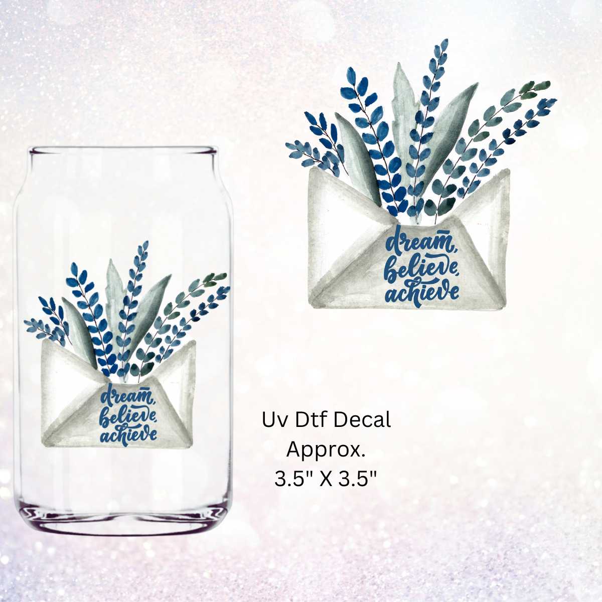 Bring positivity and inspiration to your favorite surfaces with our "Dream Believe Achieve" single-sided UV DTF decal! Featuring an envelope filled with lavender and beautifully scripted words, this decal serves as a daily reminder to pursue your goals with confidence. Perfect for use on mugs, notebooks, planners, or any smooth hard surface, this durable decal is both uplifting and stylish.