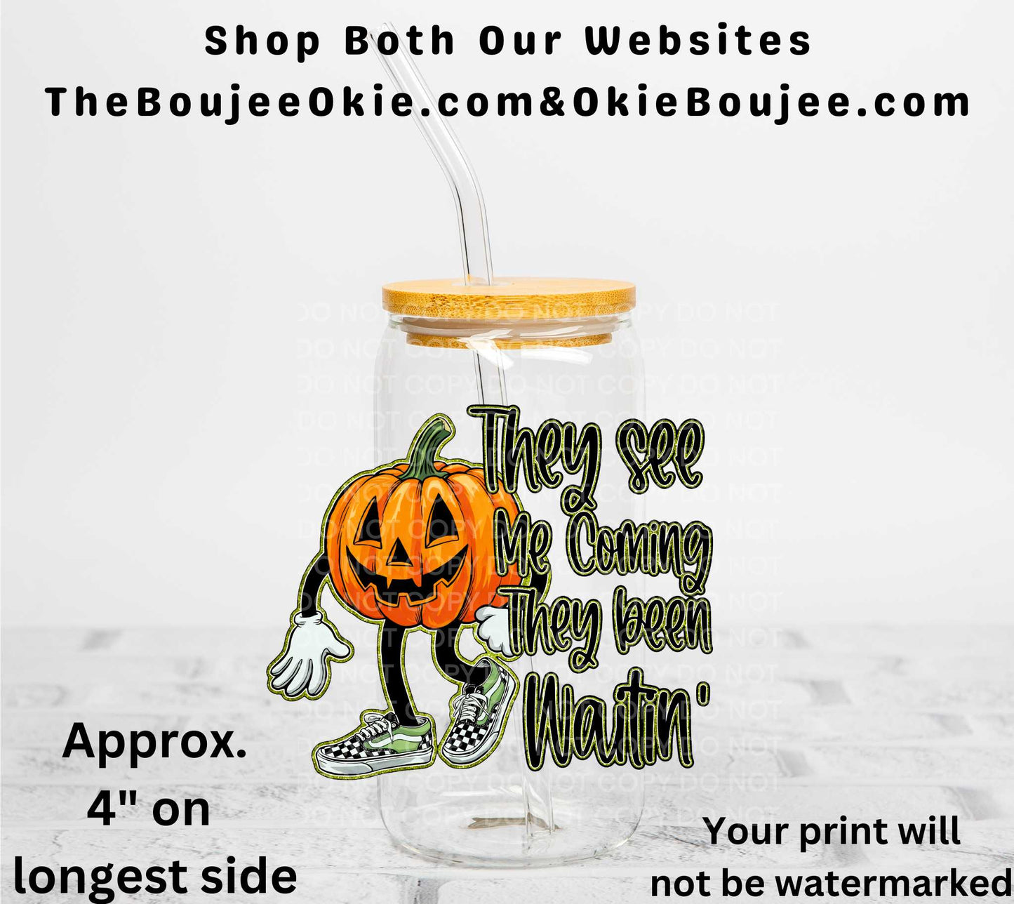 They See Me Coming They Been Waitin' Pumpkin UV DTF Decal Double Sided